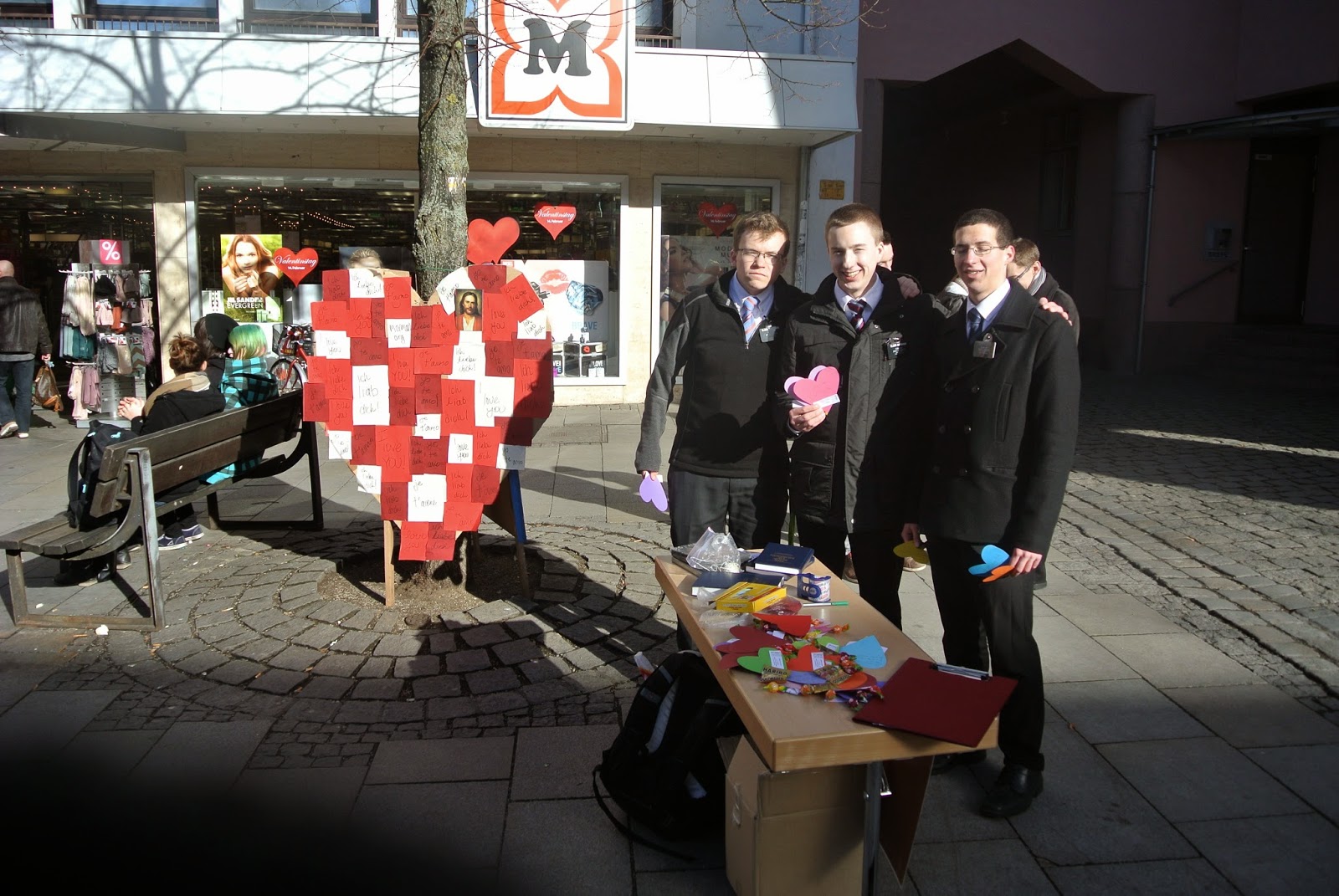 Street display! Gosh it was crazy. But, crazy good. We handed out hearts and candy and Buch Mormons and love. It made so many people happy and we got some potential investigators from it! It was so awesome! Then, I went on another split (I'll save the details, ha. Crazy) with Elder Ludlow, to Ansbach, to have our second attempt at an interview with Chris. Everything went through and he passed! The Reeders were SO NICE that they bought us Popeyes chicken, off the American military base there. My goodness, was I in heaven! Nothin' like good old 'merican food. :) Then, since we got home late again, we slept over at the Nürnberg elders apartment. Luckily, I had a toothbrush this time. :)